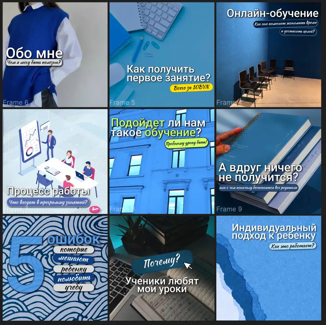 Создаём 6–12 универсальных макетов для постов под разные форматы: анонсы, продажи, полезный контент, обзоры. Продумываем визуальную сетку, чтобы лента выглядела целостно и вызывала желание подписаться.